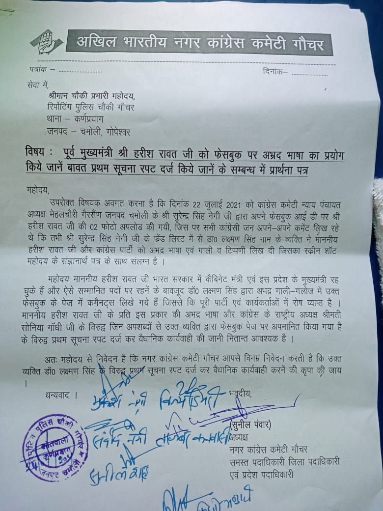 गौचर। पूर्व मुख्यमंत्री हरीश रावत के विरुद्ध अभद्र टिप्पणी करने वालों के खिलाफ कांग्रेस नगर मंडल अध्यक्ष सुनील पवार ने गौचर पुलिस चौकी में तहरीर दी है उन्होंने अभद्र टिप्पणी करने वाले व्यक्ति डॉ लक्ष्मण सिंह के खिलाफ कड़ी से कड़ी कार्यवाही करने की मांग की है ।