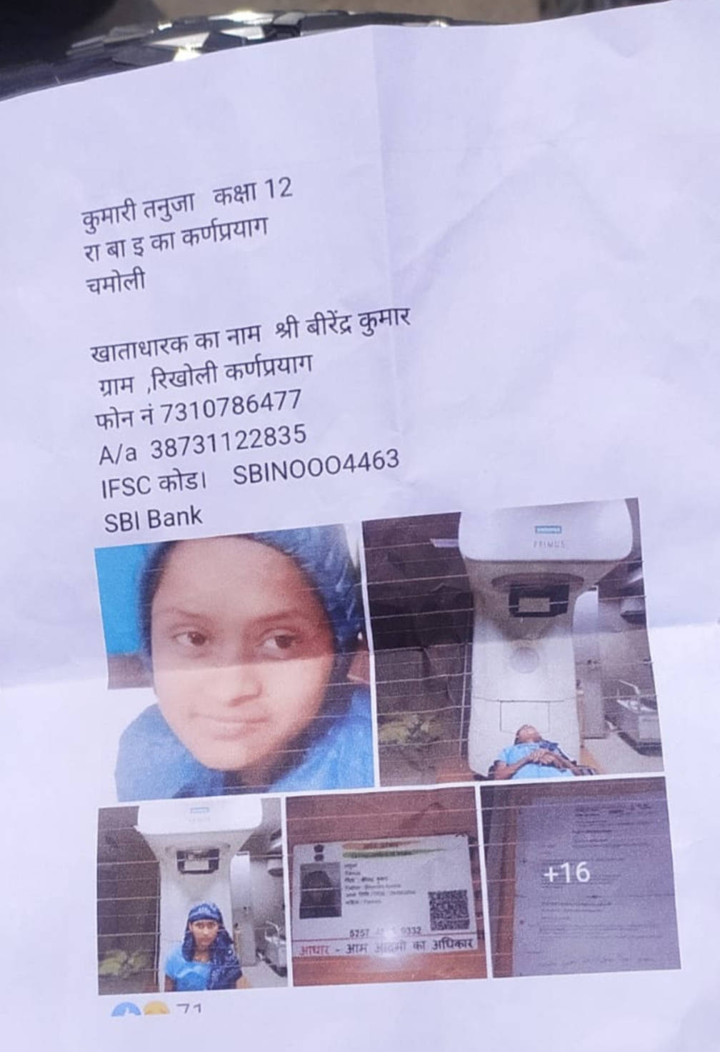 कर्णप्रयाग। जनपद चमोली की राजकीय बालिका इंटर कालेज कर्णप्रयाग में पढ़ने वाली होनहार बालिका कुमारी तनुजा जो कि वर्तमान में 12वीं की छात्रा है, और पिछले 2 वर्षों से कैंसर से जूझ रही है, विद्यालय परिवार के द्वारा भी बालिका की आर्थिक मदद की गई ,लेकिन यह मदद बीमारी के इलाज हेतु पर्याप्त नहीं हो पाई। तनुजा का परिवार बेहद गरीब हैं घर के हालात प्रतिकूल हैं, पिता प्राइवेट जॉब करते थे ,लेकिन अभी अपनी बेटी के साथ देहरादून के जालीग्रांट हॉस्पिटल में हैं। सामाजिक कार्यकर्ता मनीष पुरोहित ने बताया इन परिस्थितियों में हमारा व्यक्तिगत प्रयास भी पर्याप्त नहीं है। बहुत ही उम्मीद के साथ इस पोस्ट को शेयर कर रहा हूं ।मजबूर परिवार के साथ नियति की क्रूरता को तो नहीं समझ पाएंगे ,लेकिन हमारे द्वारा किया गया छोटा सा प्रयास हो सकता है कि इस बच्ची और परिवार को मानसिक मजबूती दे पाये, मैं इस पोस्ट में उनका अकाउंट नंबर, हॉस्पिटल के पेपर भी शेयर कर रहा हूं। आप और जानकारी के लिए मुझसे भी संपर्क कर सकते हैं।