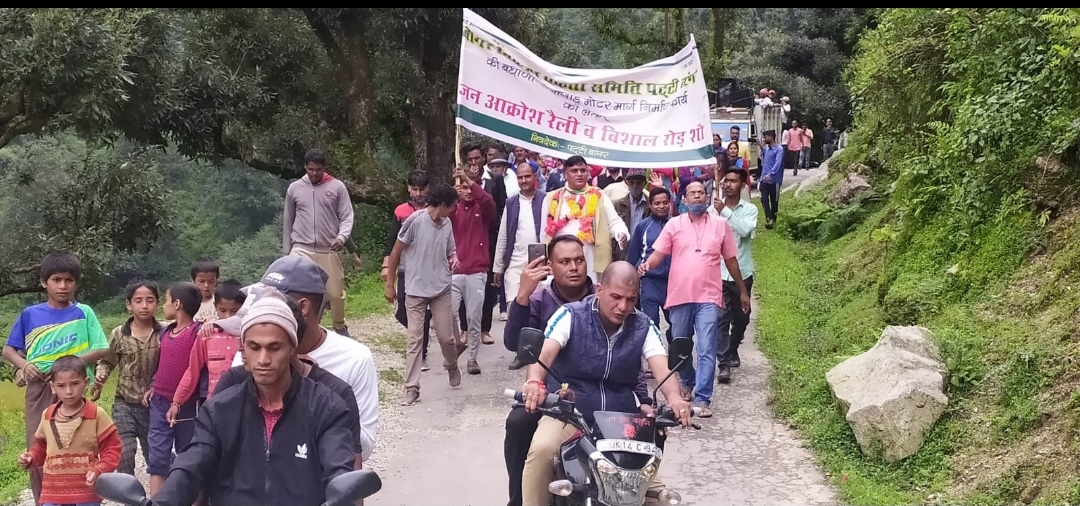 बधाणी छेनागाड़ मोटर मार्ग को हाटमिक्स डामरीकरण करने की मांग को लेकर निकाली गई जनाक्रोश रैली