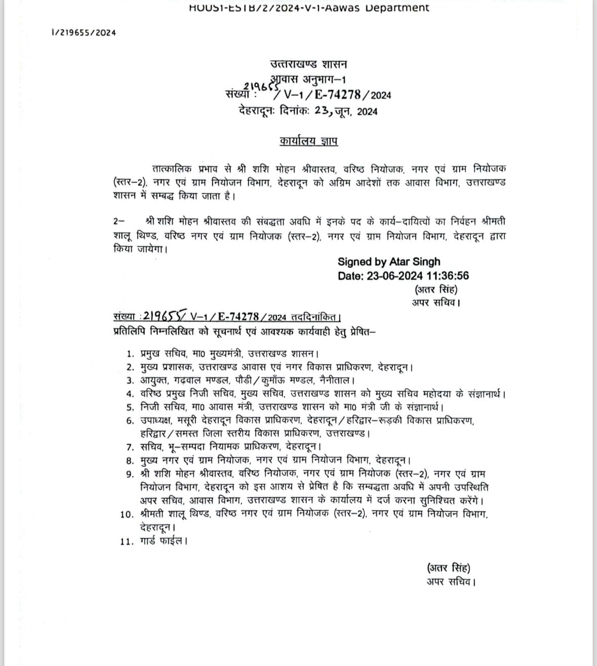 सूत्रों के हवाले से बड़ी खबर : भ्रष्टाचार संबंधी शिकायत प्राप्त होने,काम को रोकने संबंधी आरोपों पर धामी सरकार का सख्त फैसला, टाउन प्लानिंग के एचओडी एसएम श्रीवास्तव पर कड़ा एक्शन