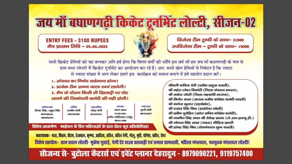 जय मां बधाणगड़ी क्रिकेट टूर्नामेंट का अध्यक्ष पवन रावत और हरीश सोलियाल(पान्डु), उपाध्यक्ष पृथ्वी नेगी, सचिव गम्भीर नेगी, कोषाध्यक्ष दीपक सिंह, राहुल सिंह,सह सचिव गौरव नेगी तथा ग्राम प्रधान मुकेश गुसाई ने अधिक से अधिक टीमों को प्रतिभाग करने हेतु आमंत्रित किया है।