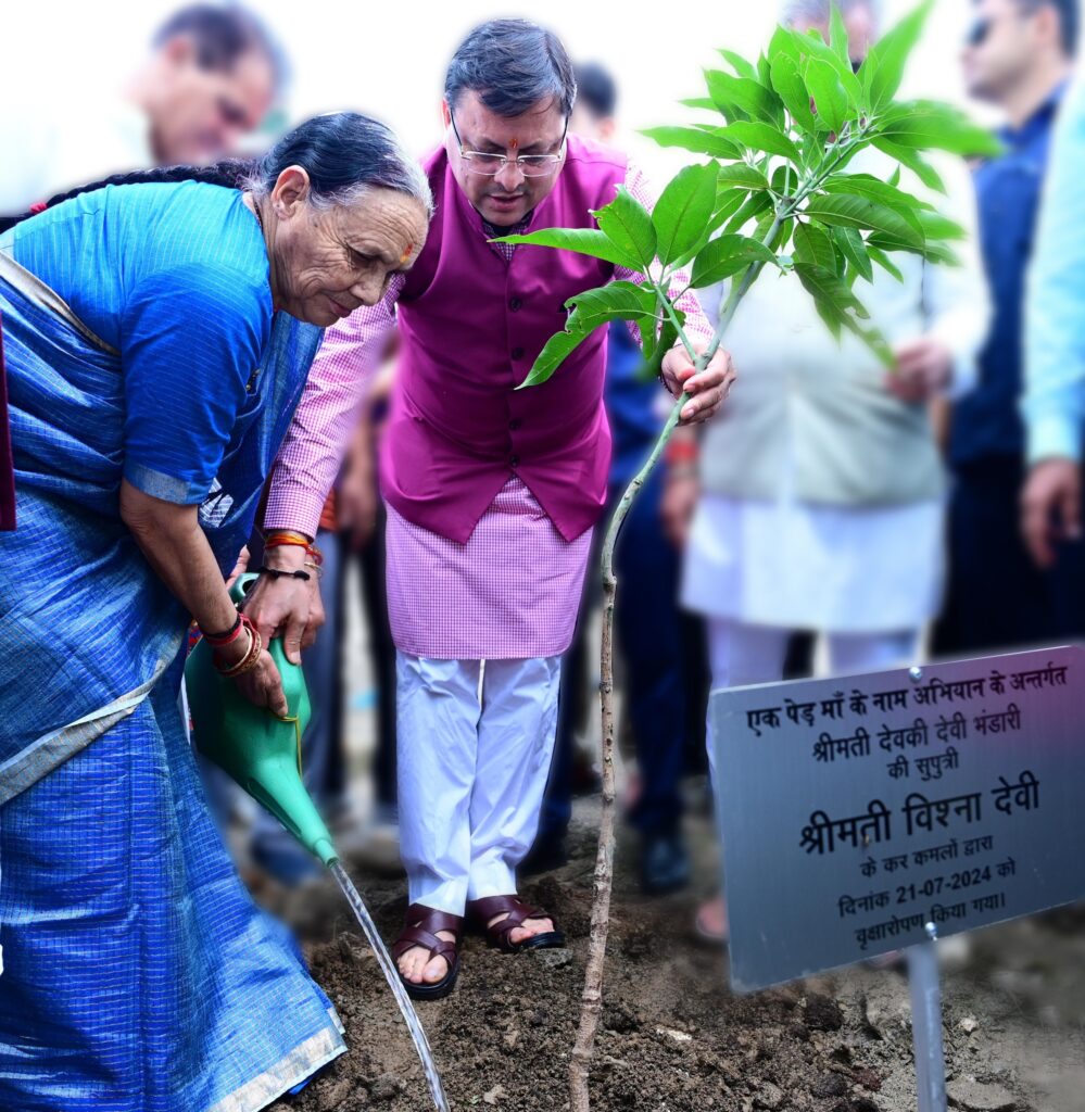 इस अवसर पर मुख्यमंत्री पुष्कर सिंह धामी ने अपनी माताजी श्रीमती बिशना देवी के नाम से पौधारोपण किया। इस अवसर पर उनकी माताजी भी मौजूद रहीं। इस अवसर पर मुख्यमंत्री ने कहा कि विश्व पर्यावरण दिवस के अवसर पर प्रधानमंत्री श्री नरेन्द्र मोदी ने ‘एक पेड़ माँ के नाम’ लगाने की देशवासियों से अपील की थी। राज्य में इसे अभियान के रूप में लिया गया है। मुख्यमंत्री ने सभी प्रदेशवासियों से आह्वाहन किया है कि इस मानसून सीजन में एक पेड़ माँ के नाम जरूर लगाएं।