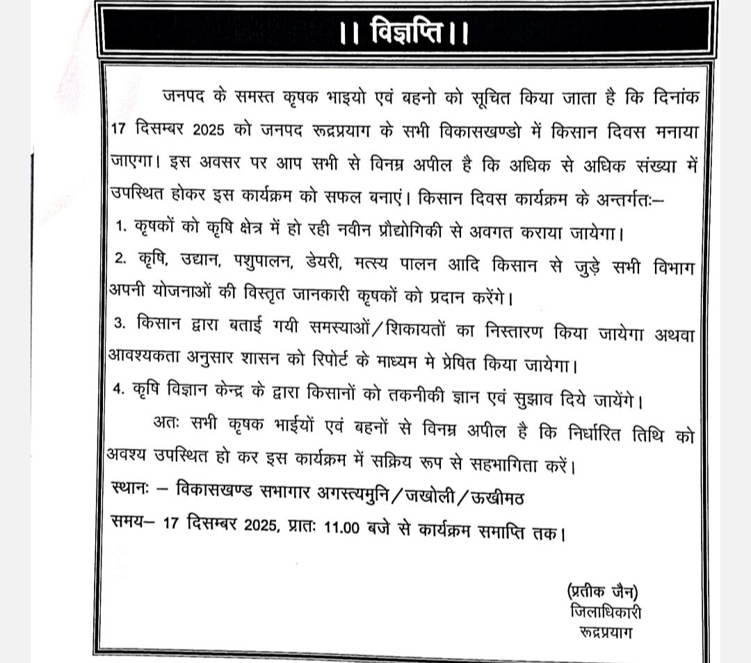 रूद्रप्रयाग। जिलाधिकारी प्रतीक जैन ने जानकारी देते हुए बताया कि जनपद के समस्त कृषक भाइयो एवं बहनो को सूचित किया जाता है कि दिनांक 17 दिसम्बर 2025 को जनपद रूद्रप्रयाग के सभी विकासखण्डो में किसान दिवस मनाया जाएगा। इस अवसर पर आप सभी से विनम्र अपील है कि अधिक से अधिक संख्या में उपस्थित होकर इस कार्यक्रम को सफल बनाएं। किसान दिवस कार्यक्रम के अन्तर्गतः-