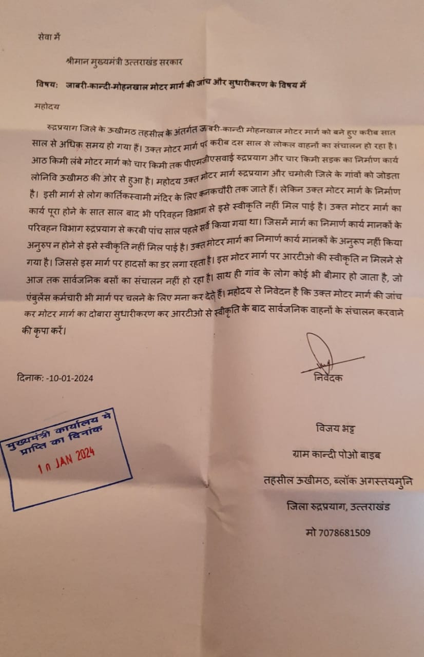 जाबरी कांदी मोहनखाल मोटरमार्ग को बने दस साल हो चुके हैं। निर्माण कार्य भी पिछले सात साल में पूरा हो गया है। लेकिन आज भी इस मोटरमार्ग को परिवहन विभाग की स्वीकृति का इंतजार है, इस मोटरमार्ग की स्वीकृति को बार-बार इसलिए टाल दिया जाता है कि निम्न गुणवत्ता से इस मोटरमार्ग का निर्माण कार्य किया गया है।