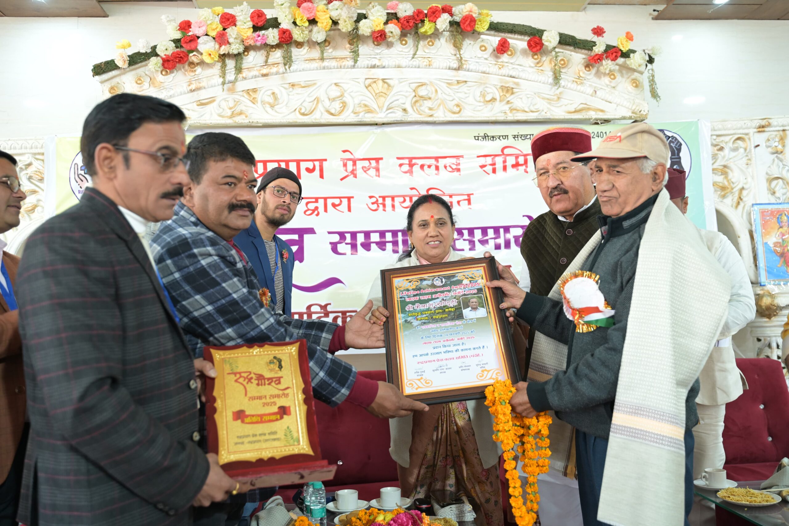 कार्यक्रम में पूरे जीवन पत्रकारिता एवं सामाजिक कार्यों में बढ़चढ़ कर भागीदारी करने वाले वयोवृद्ध पत्रकार कैलाश खण्डूरी को उनके योगदान को देखते हुए रूद्रप्रयाग प्रेस क्लब समिति द्वारा उन्हें लाइफ टाइम अचींमेंट अर्वाड 2025 दिया गया। उनका साॅल ओढ़ाकर सम्मान किया गया साथ ही प्रश्ति पत्र व स्मृति चिन्ह भी दिया गया।