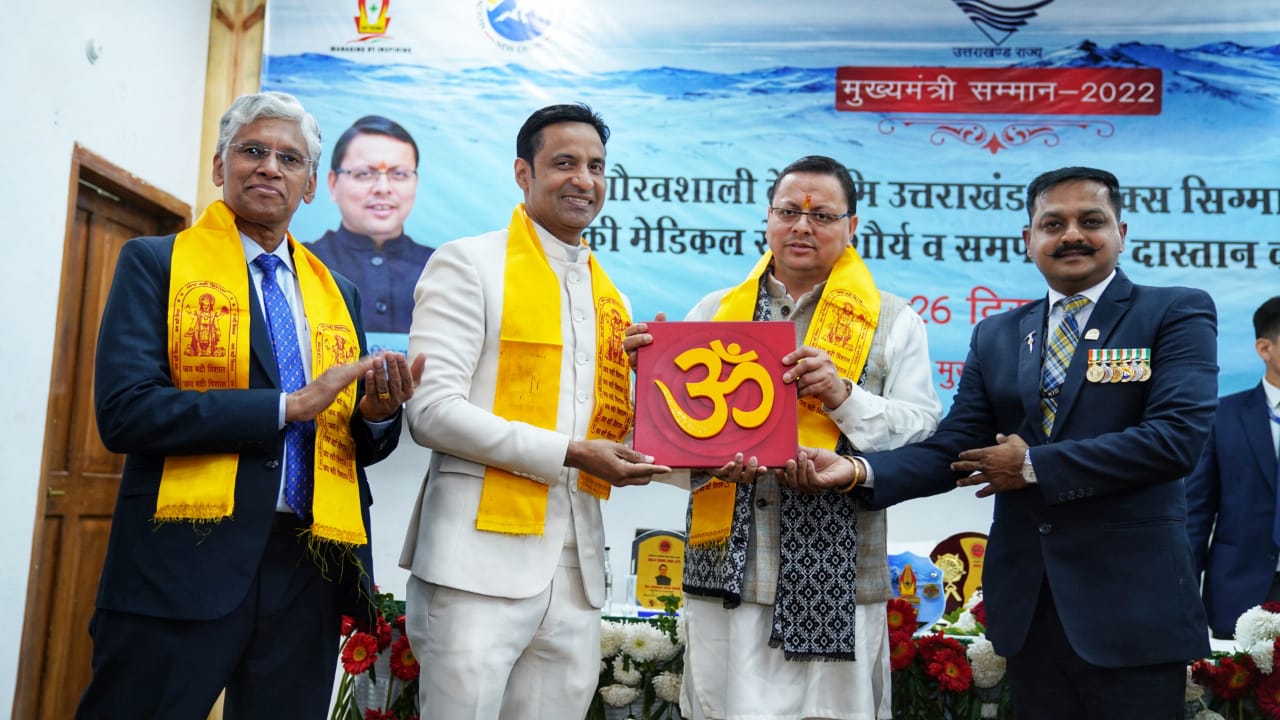 मुख्यमंत्री पुष्कर सिंह धामी ने सोमवार को मुख्यमंत्री आवास स्थित मुख्य सेवक सदन में सिक्स सिग्मा हैल्थ केयर-हाई एल्टीट्यूड मेडिकल सर्विसेज के चिकित्सकों को सम्मानित किया।