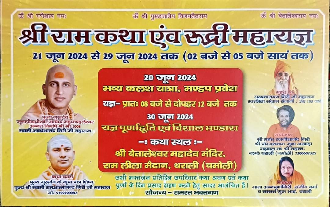 थराली बेतालेश्वर मंदिर के महंत रजनीशानंद गिरी महाराज ने बताया रामलीला मैदान थराली में 21 जून से 29 जून तक नौ दिवसीय रामकथा की जाएगी तथा 30 जून को विशाल भण्डारे का आयोजन भी किया जाएगा साथ ही रुद्री महायज्ञ का आयोजन भी किया जाएगा, तथा आज बृहस्पतिवार को कलश यात्रा के पश्चात रामकथा के व्यास महामण्डलेश्वर अवधेशानंद गिरी महाराज के शिष्य पूज्य स्वामी रामआत्मानंद गिरी महाराज द्वारा मंडप प्रवेश किया जाएगा।