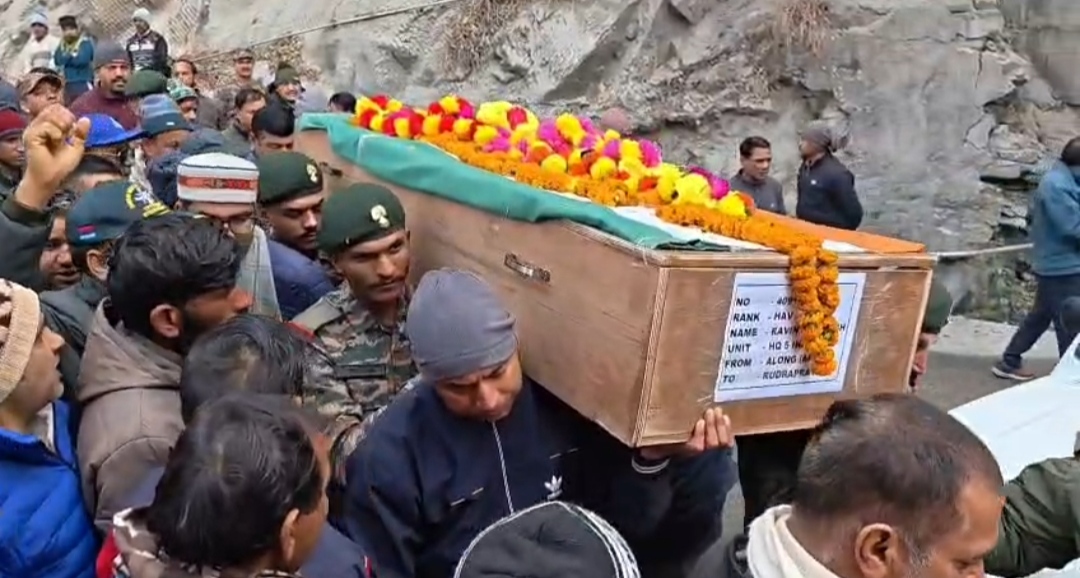 अरुणाचल प्रदेश की दुर्गम सीमाओं पर मां भारती की सेवा करते हुए रुद्रप्रयाग जनपद के आगर गाँव निवासी 15 गढ़वाल राइफल्स में तैनात हवलदार रविन्द्र सिंह के वीरगति को प्राप्त हो गया। शहीद का पार्थिव शरीर आज उनका पैतृक गाँव पहुंचा तो परिजनों और ग्रामीणों के रोने बिलखने और चीख-पुकार से पूरा माहौल गमगीन हो गया। इसके बाद अलकनंदा मंदाकिनी नदी संगम पर पूरे सैन्य सम्मान के साथ उनका अंतिम संस्कार किया गया। शहीद को पुष्पांजलि अर्पित करने के लिए बड़ी संख्या में राजनेता, सामाजिक कार्यकर्ता, प्रशासनिक अधिकारी, पुलिस अधिकारी मौजूद रहे ।