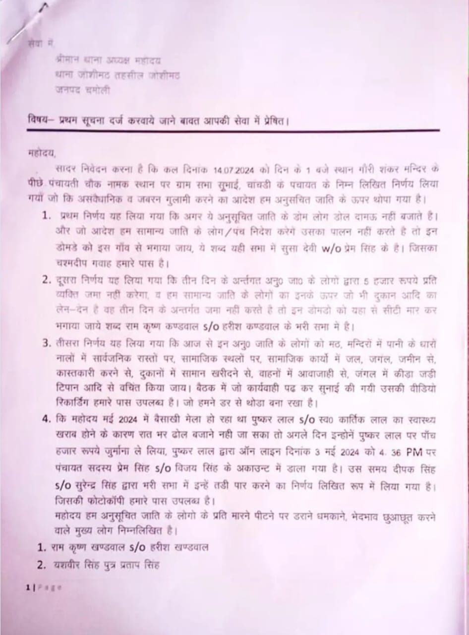 यही नहीं जातीसूचक शब्दों का प्रयोग कर गंदी गालियां दी जा रही है। जिला प्रशासन को इसका संज्ञान लेना चाहिए बताया कि पीड़ित व्यक्तियों द्वारा जोशीमठ थाने में 15 जुलाई को सामूहिक रूप से तहरीर दी गई पुलिस मौके पर पहुंची लेकिन उत्पीड़न करने वालों की गिरफ्तारी नहीं की गई, तत्काल उनकी गिरफ्तारी होनी चाहिए।